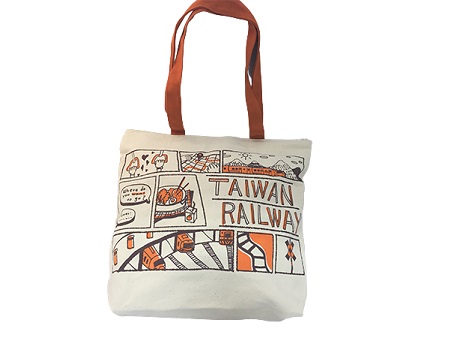 雙面手繪;以鐵道旅行為主題,透過漫畫風格呈現;復古色系更顯鐵路悠久歷史;提把與袋面拼接,用久不顯髒汙;布標縫製LOGO。