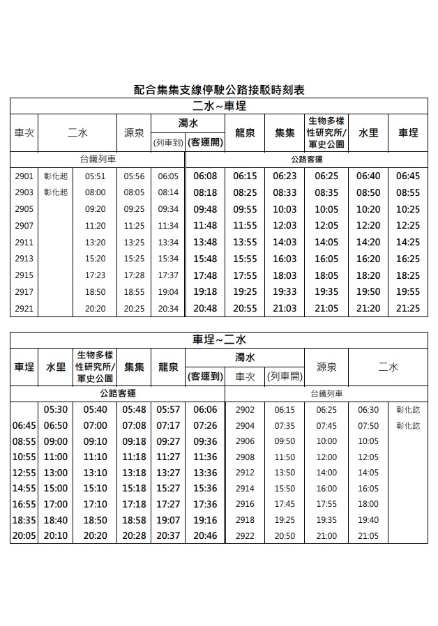 受前述改善工程影響,集集支線列車將截短行駛二水站至濁水站區間,每日開行18列次,濁水站至車埕站區間停駛,公路接駁服務區間為濁水站至車埕站,接駁作業比照現行集集站至車埕站公路接駁模式辦理,且為便利旅客轉乘服務假日將增加接駁車輛數,並規劃增停農業部生物多樣性研究所/軍史公園,以促進在地觀光旅遊。