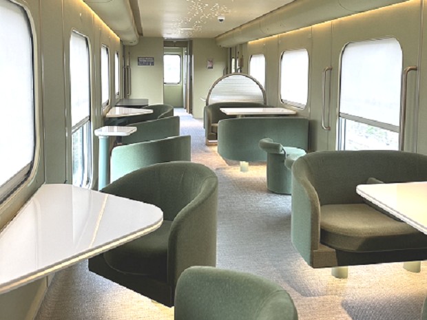車內全景落地窗,讓乘客輕鬆欣賞窗外翠綠山林與壯麗景致。